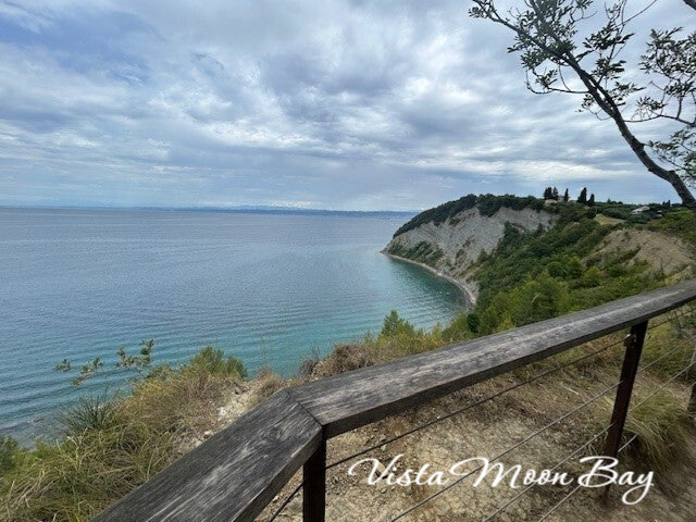Entre sombras de los pinos y desde donde se ve la playa Moon Bay, con forma de media luna y aguas cristalinas, dicen de las más bonitas de Eslovenia.